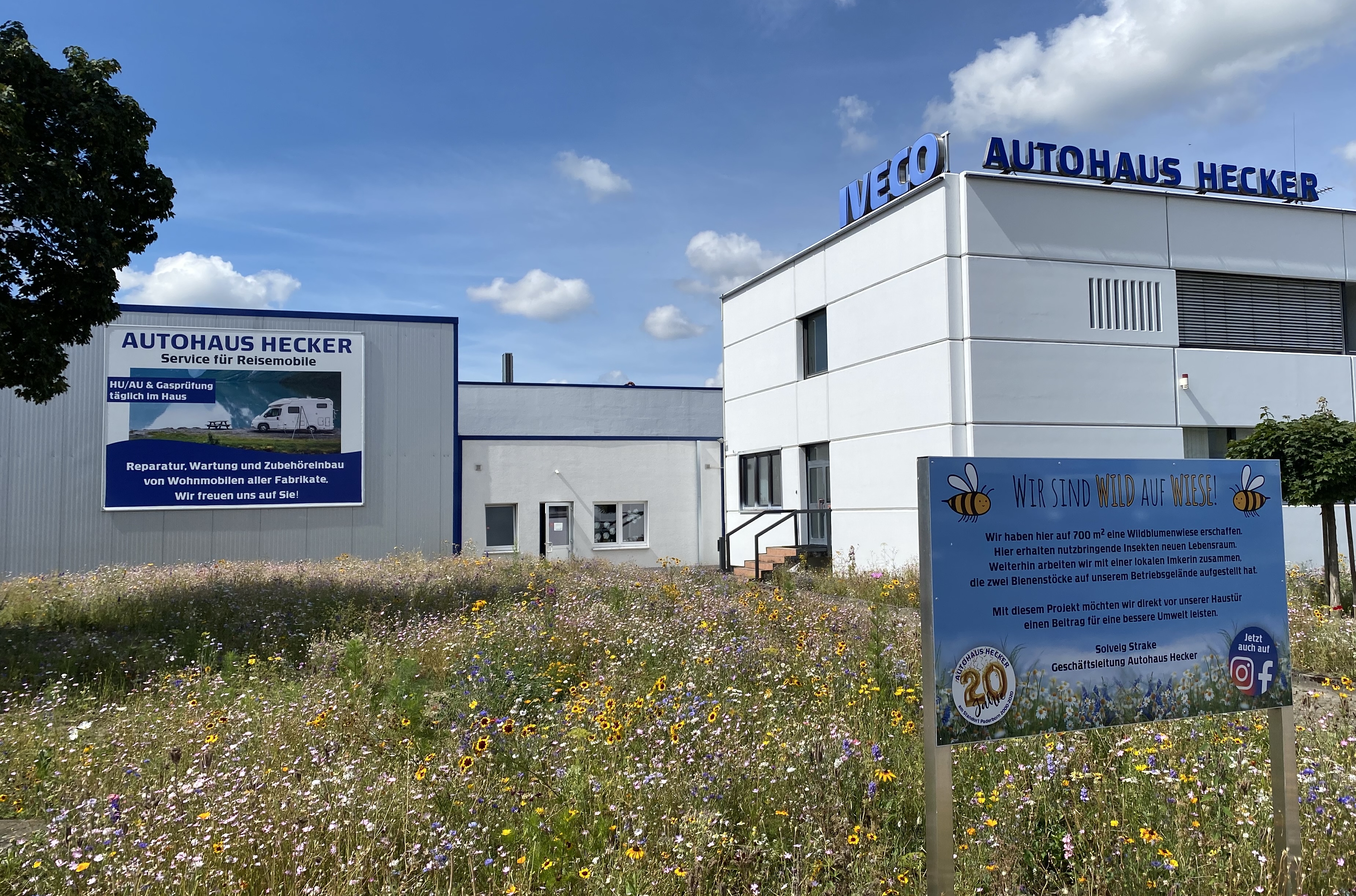 Wir erschaffen im Frühjahr 2020 auf unserem Betriebsgelände in Paderborn eine Wildblumenwiese. Hier erhalten nutzbringende Insekten neuen Lebensraum. Weiterhin arbeiten wir mit einer lokalen Imkerin zusammen, die im Frühjahr zwei Bienenstöcke auf unserem Betriebsgelände aufstellt.
